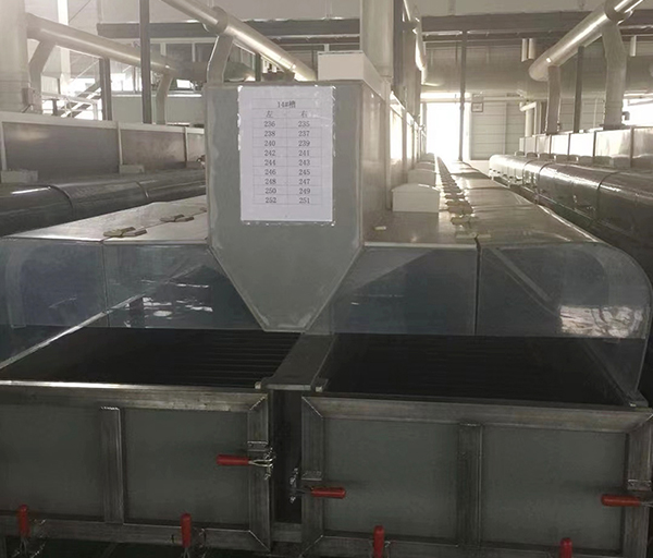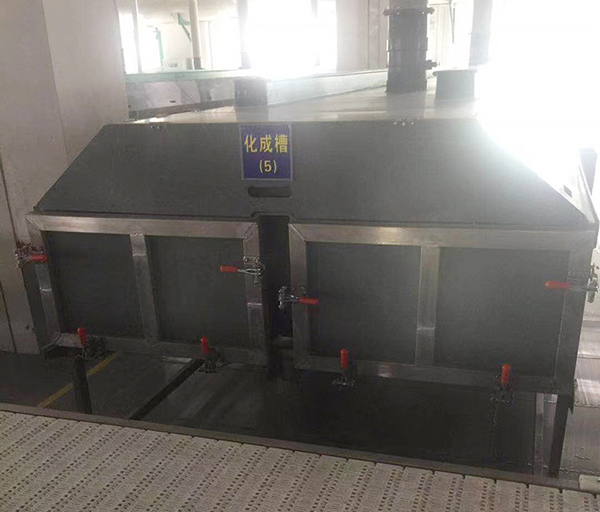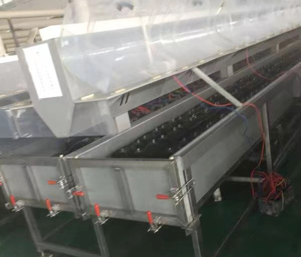 工艺简介:电池加酸完毕后有自动输送线输送到指定化成线,由活动小车与指定化成线连接,化成线侧门自动打开,电池按秩序进人化成线活动链板,并自动拉开电池与电池间的间隙,间隙的宽度可以自动调整。电池进入指定位置后,化成线侧门自动关闭自动加入冷却水至指定高度,汽缸自动打开化成线观察门,由人工进行连接导线。连接完毕后自动关闭观察门,循环冷却水进行自动恒温冷却,抽风系统自动抽风,并带出电池散发出的热量,由室外净化系统进行净化排放。化成完毕后,门自动打开,由人工拆除连接导线,冷却水排放至蓄水池电池由侧门经活动小车进入电池下线系统输送到电池收集区进行整理包装。