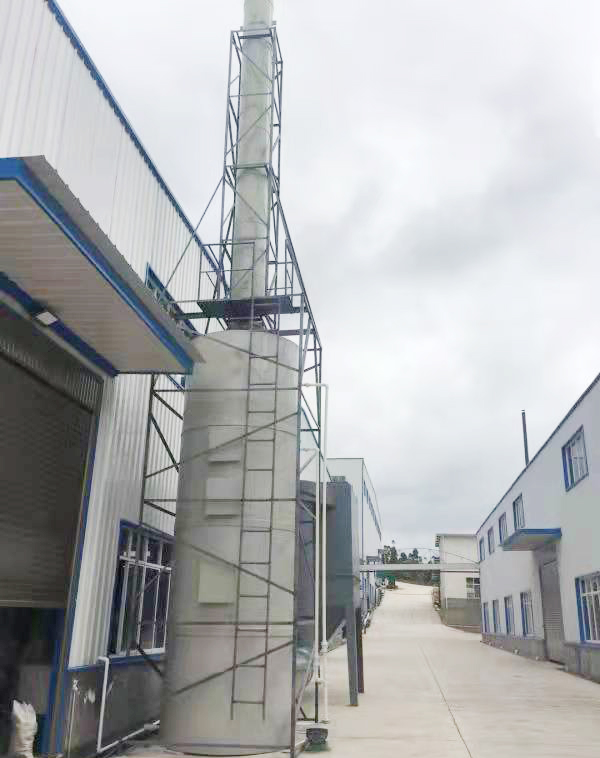 工艺流程:和膏过程中会产生酸零及粉尘,需要进行处理;喷淋式和膏除尘器采用二级喷淋系统及二级过滤系统,适合处理含少量粉尘的气体;干净的水由塔上部喷淋,含尘气体由塔下部旋流而上;当含尘气体经塔下部过滤层时,粉尘与淋湿的过滤介质相遇,粘在过滤介质表面,同时气体的流速带动过滤介质,使得过滤介质旋转、跳动,可让过滤介质表面各处能充分吸附粉尘,同时也可让喷淋液充分沖洗过滤介质表面各处,提高过滤面积及效果;经过下层过滤层及喷淋系统后,相对洁净的气体再次经过上层过滤层,进行相同的过滤过程,使得气体的洁净程度再次提高;最后气体经过脱液装置,处理掉气体中的水分,经排放管达标排放。本设备既满足合膏的风冷却需要,又满足环保排放之要求。